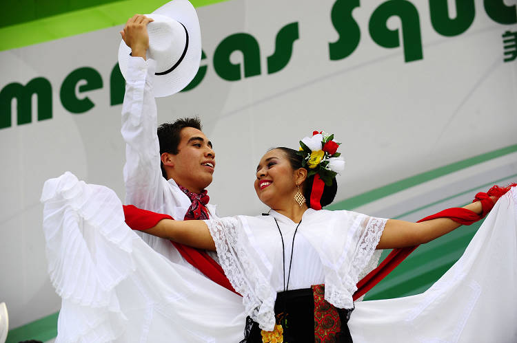 5月2日,墨西哥“哈里斯科州舞蹈團(tuán)”的演員在世博園內(nèi)的美洲廣場(chǎng)為游客表演舞蹈。演員們飽滿的熱情和奔放的舞步感染了現(xiàn)場(chǎng)的每一位觀眾。新華社記者任勇攝