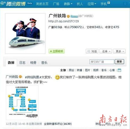 丁建庭 來源: 南方日報[提要] 春運即將到來,許多網(wǎng)友開始擔心“買票難”。記者統(tǒng)計發(fā)現(xiàn),全國18個鐵路局都已開通騰訊和新浪微博,同時,哈爾濱鐵路局、沈陽鐵路局還開通了100多個機務(wù)段、車站等部門的微博。據(jù)介紹,18個鐵路局將通過各自的官方微博發(fā)布春運相關(guān)信息,第一時間為廣大網(wǎng)友提供信息服務(wù)。