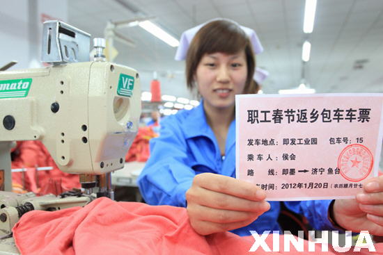來源: 新華網(wǎng)山東頻道[提要] 春節(jié)前夕,青島即發(fā)集團(tuán)成立專門的春運(yùn)小組,包租大巴、自制車票,免費(fèi)送該企業(yè)山東省內(nèi)的2000多名外來務(wù)工人員回家過年。據(jù)悉,這些外來務(wù)工人員將于1月20日(臘月27日)乘坐專車返鄉(xiāng)。 1月16日,一名青島的外來務(wù)工人員展示回家過年的免費(fèi)車票