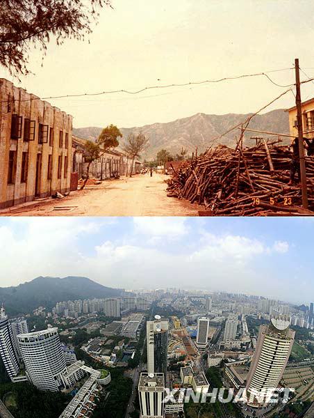 上圖:開發(fā)前的深圳蛇口老街(1979年5月23日攝)。下圖:高樓林立的深圳蛇口工業(yè)區(qū)(2008年10月10日攝)。1979年,中共中央作出了創(chuàng)辦經(jīng)濟特區(qū)的決策。以創(chuàng)辦經(jīng)濟特區(qū)為標(biāo)志,中國的對外開放邁出了重要步伐。 新華社發(fā)(資料圖片)
