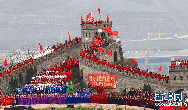 資料圖片:3月4日,為迎接建黨90周年,重慶洋人街風(fēng)景區(qū)“長(zhǎng)城”景點(diǎn)舉行千人紅歌會(huì)。3000余名市民登上“長(zhǎng)城”,共同唱響《歌唱祖國(guó)》《紅梅贊》《四渡赤水》等近40首紅歌。重慶晚報(bào)/IC