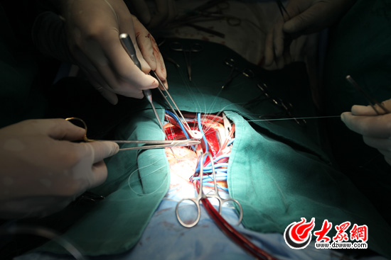 來(lái)源:大眾網(wǎng)9:35分,一種特殊材質(zhì)制作的直徑約1.5公分的修補(bǔ)物進(jìn)入心包外腔,被一條條縫合線牽引著。醫(yī)護(hù)人員快速的穿針引線,將修補(bǔ)物縫合。