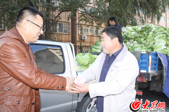 大眾網(wǎng)濟(jì)南11月20日訊(記者 姜洋)“我們要8500斤,拿走1500斤,剩下的7000斤請大眾網(wǎng)轉(zhuǎn)送給需要白菜的家庭吧!苯裉,濟(jì)南結(jié)束了兩天的陰霾,迎來了雨后艷陽天,由大眾網(wǎng)發(fā)起的“今冬請吃愛心菜”活動(dòng),讓困擾著菜農(nóng)的白菜走進(jìn)市區(qū)直銷。在百花小區(qū)的直銷點(diǎn),濟(jì)南領(lǐng)富運(yùn)輸有限公司辦公室主任劉殿杰和馬紅軍代表單位前來購買了8500斤白菜,并且提出將其中的7000斤白菜委托大眾網(wǎng)轉(zhuǎn)送給需要的家庭。