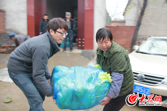 聽說愛心企業(yè)來了,唐西村村民將剛剛摘下并包裝好的新鮮白菜運出來。