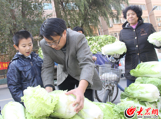 早晨10:00,第一輛“愛心白菜車”來到位于花洪路西段路南的花園小區(qū)銷售點。一看到“大眾網今冬請吃愛心菜直銷車”的橫幅,附近的居民便紛紛上前購買大白菜,你買兩棵我買三棵,你買一口袋我裝一小推車,不一會的功夫,“愛心菜直銷車”前就擠滿了前來購菜的愛心市民,其中包括早已等候多時的大眾網“奔騰車友會”的網友們。不少駕車路過的市民也趕緊停下車,擠到直銷車前“搶”上幾棵大白菜。臨到中午的時候,一車足有8000斤的大白菜已經賣了一半。