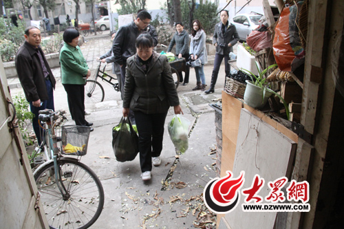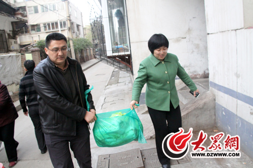 大眾網(wǎng)記者和街道負(fù)責(zé)人往困難居民家中送菜