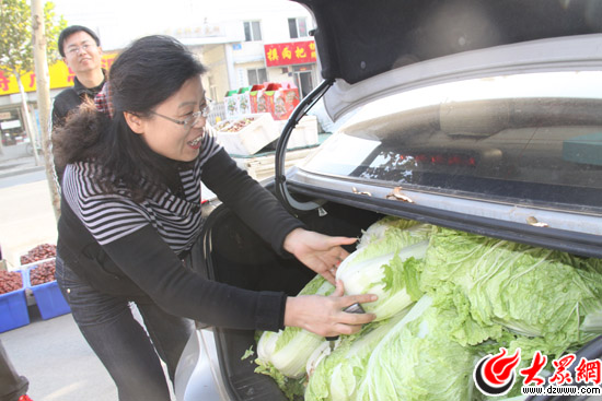 在百花小區(qū)直銷點(diǎn),齊魯手機(jī)報(bào)讀者徐女士看著汽車后備箱裝得滿滿的大白菜,她高興得說(shuō),自己今天這30公里的路沒(méi)有白來(lái),回去要把這份愛(ài)心與親友分享
