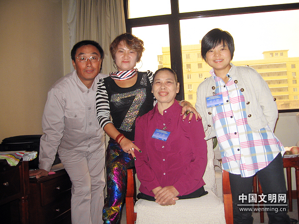 在兩個(gè)“女兒”面前,一個(gè)是哪里有困難就把愛心灑向哪里的“雷鋒傳人爸爸”郭明義(左一),一個(gè)是從哪里跌倒就在哪里回報(bào)社會(huì)的“板凳媽媽”許月華(右二)。既然已經(jīng)站立,就要懷著感恩的心去走好每一步。中國(guó)文明網(wǎng) 逯江南 9月17日攝