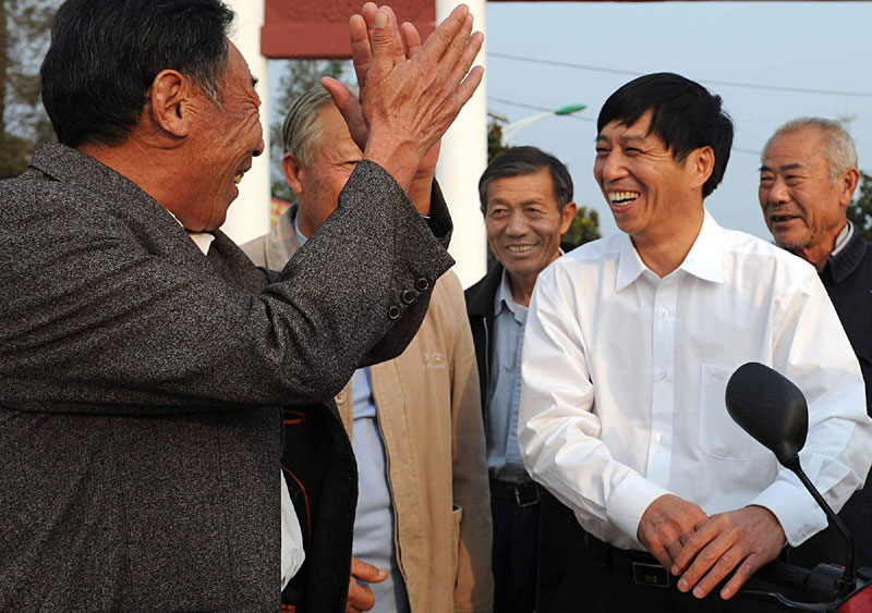 這是2008年10月7日,沈浩(前右)與大包干帶頭人關(guān)友江、嚴(yán)俊昌、嚴(yán)金昌、嚴(yán)學(xué)昌交流小崗村的改革發(fā)展情況。新華社記者王雷攝