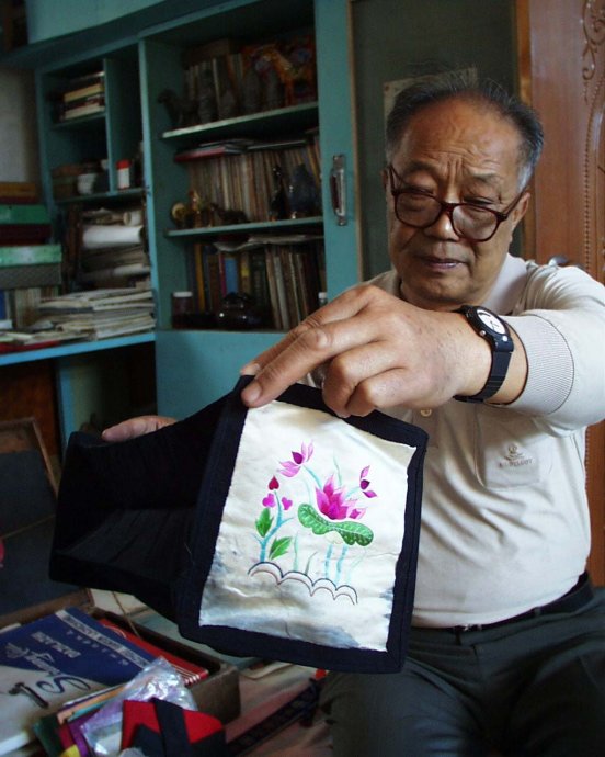 2001年9月,趙朝勛向記者展示他眾多收藏品之一:滿族的刺繡枕頭底。