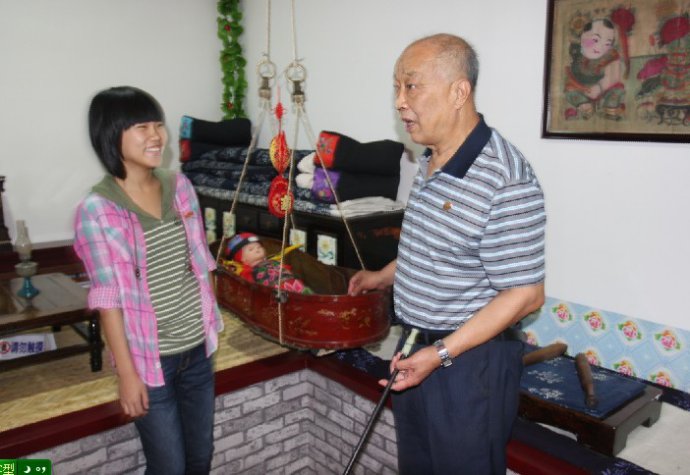 2011年6月26日,趙朝勛老人向“走進(jìn)56個民族”回訪記者團(tuán)的小記者施哲瑩介紹滿族傳統(tǒng)民族中的“口袋房、萬字炕、煙囪壘在地面上”。