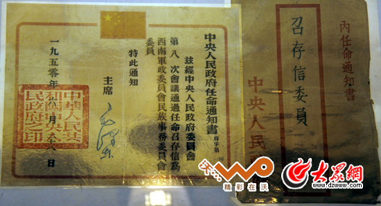 客廳四周的墻壁上,一面掛滿了召存信和刀美蘭兩位老人各個(gè)時(shí)代的合影,另一面墻上則掛著召存信同各個(gè)時(shí)代中國(guó)領(lǐng)導(dǎo)人的合影,以及裝裱起來(lái)的毛主席親自簽發(fā)的州長(zhǎng)任命書。坐定以后,老人邊說(shuō)邊用手比劃著,言語(yǔ)不多,說(shuō)話卻異常高亢、清晰,一字一頓……