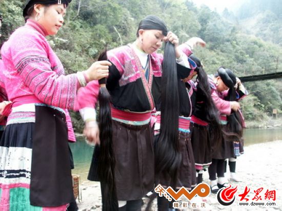 紅瑤婦女認(rèn)為,頭發(fā)是生命的一部分,不能隨意丟棄,她們把梳頭時(shí)梳落的長發(fā)一根根收集起來,珍愛地與長發(fā)一起盤在頭上。紅瑤婦女蓄發(fā)、護(hù)發(fā)、洗發(fā)都是沿襲祖?zhèn)髅胤,從不外傳。家家火塘邊都有一個(gè)瓷罐,那是專門制作洗發(fā)、護(hù)發(fā)方劑的,主要成份是淘米水。紅瑤女用自制的“洗發(fā)露”浸潤,洗完頭發(fā)后不急于沖洗,而是讓洗發(fā)露在頭發(fā)上至少停留半小時(shí)以上,讓營養(yǎng)充分吸收后才到山泉旁沖洗,讓頭發(fā)自然風(fēng)干。這樣洗出來的頭發(fā),長得快,柔順、烏黑亮麗,不開叉。
