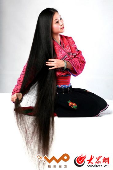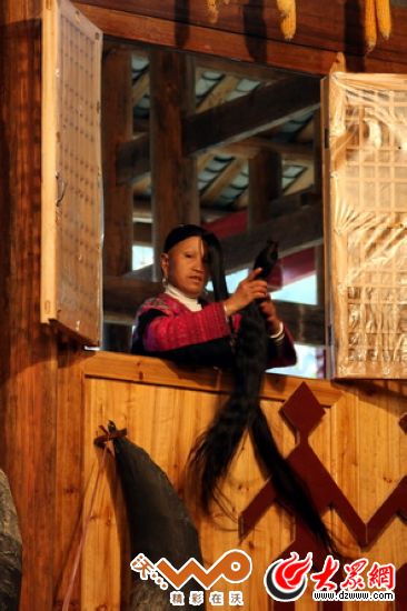 紅瑤婦女愛美出了名,愛蓄長發(fā)也出了名,她們以長發(fā)為美,從七八歲就開始蓄發(fā),十七八歲的姑娘長發(fā)就有一米以上。九年前我采訪的黃洛瑤寨僅有68戶人家,頭發(fā)超過一米的婦女就有60多位,最長的達(dá)1.8米,以“集體長發(fā)之最”被收入世界吉尼斯紀(jì)錄。