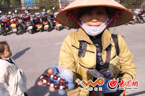 東興口岸中國境內(nèi),越南女子向記者兜售手工藝品。如今兩岸邊民來往的免稅貨物由原先的5000元已經(jīng)提高為8000元。