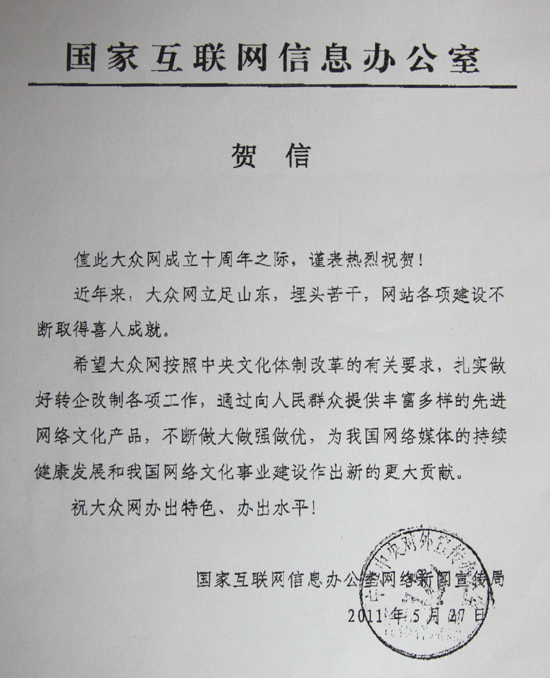 來(lái)源: 大眾網(wǎng)[提要] 值此大眾網(wǎng)成立十周年之際,謹(jǐn)表熱烈祝賀!近年來(lái),大眾網(wǎng)立足山東,埋頭苦干,網(wǎng)站各項(xiàng)建設(shè)不斷取得喜人成就。希望大眾網(wǎng)按照中央文化體制改革的有關(guān)要求,扎實(shí)做好轉(zhuǎn)企改制各項(xiàng)工作,通過(guò)向人民群眾提供豐富多樣的先進(jìn)網(wǎng)絡(luò)文化產(chǎn)品,不斷做大做強(qiáng)做優(yōu),為我國(guó)網(wǎng)絡(luò)媒體的持續(xù)健康發(fā)展和我國(guó)網(wǎng)絡(luò)文化事業(yè)建設(shè)作出新的更大貢獻(xiàn)