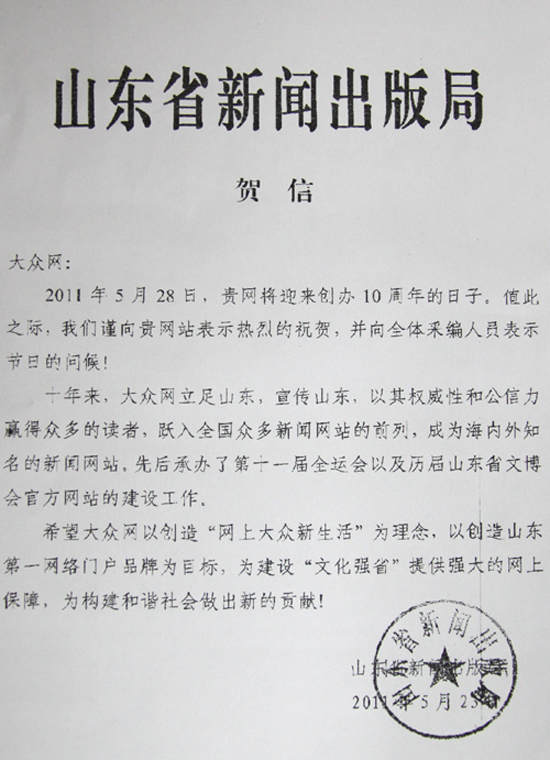 來源: 大眾網(wǎng)[提要] 2011年5月28日,貴網(wǎng)將迎來創(chuàng)辦10周年的日子,值此之際,我們謹(jǐn)向貴網(wǎng)站表示熱烈的祝賀,并向全體采編人員表示節(jié)日的問候!一年來,大眾網(wǎng)立足山東,宣傳山東,以其權(quán)威性和公信力贏得眾多的讀者,躍入全國眾多新聞網(wǎng)站的前列,