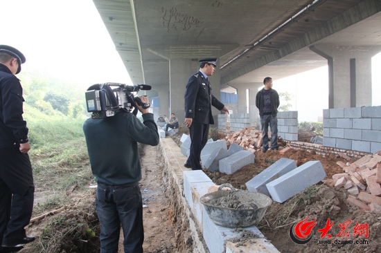 在天橋河務(wù)局巡查人員的指證下,陳剛確認(rèn)這一長溜沿街建筑侵占了黃河防洪工程的綠化地帶。在經(jīng)過民警現(xiàn)場取證之后,陳剛嚴(yán)厲地說:“這里屬于違章建筑,你們的負(fù)責(zé)人在哪里?”