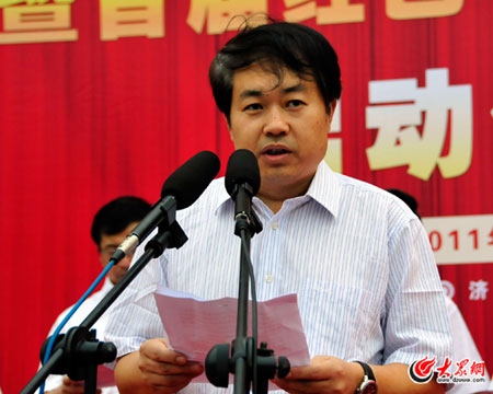 中共山東省委宣傳部常務(wù)副部長、文明辦主任姜鐵軍在啟動儀式上致辭并為采訪團(tuán)授旗。 姜鐵軍在致辭時說,山東是全國著名的紅色革命老區(qū)之一,有著光榮的革命傳統(tǒng)。舉辦“全國網(wǎng)絡(luò)媒體山東紅色老區(qū)行”大型采訪活動,就是要通過尋找革命戰(zhàn)爭年代的紅色記憶,緬懷革命先輩的豐功偉績,大力宣傳在中國共產(chǎn)黨的領(lǐng)導(dǎo)下山東紅色革命老區(qū)發(fā)生的翻天覆地的變化,鼓舞和動員廣大干部群眾,進(jìn)一步繼承和發(fā)揚(yáng)革命先輩的光榮傳統(tǒng),在全面建設(shè)小康社會的偉大實(shí)踐中,振奮精神,凈化心靈,開拓進(jìn)取,再創(chuàng)輝煌,充分發(fā)揮網(wǎng)絡(luò)傳播的獨(dú)特優(yōu)勢,借助各家網(wǎng)絡(luò)媒體的的妙筆和鏡頭,通過在濟(jì)南、濟(jì)寧、臨沂等市進(jìn)行采訪,全面展示山東老區(qū)人民的精神風(fēng)貌為慶祝建黨90周年和山東省各項(xiàng)事業(yè)的進(jìn)一步發(fā)展創(chuàng)造良好的網(wǎng)上輿論環(huán)境。
