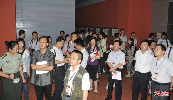 網(wǎng)絡(luò)媒體記者參觀魯西南戰(zhàn)役紀(jì)念館。