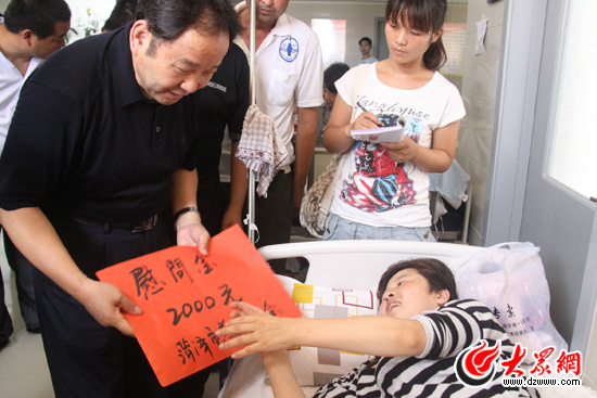 賈鳳祥把印有“網(wǎng)傳愛心 情動天下”的錦旗送到大眾網(wǎng)總編助理、采訪中心主任李冉手中。
