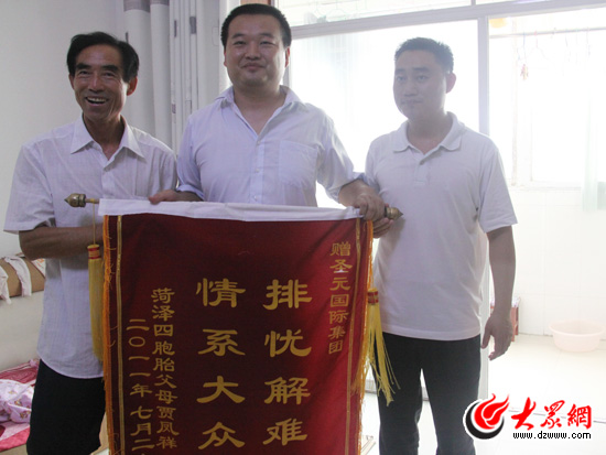 賈鳳祥把印有“排憂解難 情系大眾”的錦旗送到圣元國際集團(tuán)菏澤城市經(jīng)理張虎子手中。