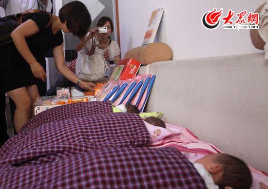 大眾網(wǎng)菏澤7月25日訊 (記者 丁厚勤)“有了大眾網(wǎng)和熱心單位的愛心相助,我有信心和條件養(yǎng)好四個(gè)孩子了!”今天上午,大眾網(wǎng)“幫幫團(tuán)”成員嬰貝兒母嬰購物廣場、圣元國際集團(tuán)、恒安集團(tuán)濟(jì)南分公司的代表冒著酷暑來到了菏澤四胞胎的家中,為孩子們帶來了奶粉和母嬰用品。因犯愁如何養(yǎng)好四個(gè)孩子已多日未眠的四胞胎爸爸賈鳳祥臉上露出了久違的笑容。在他身后,是熟睡中的嬰兒,不諳任何世事的他們,短短幾日內(nèi),卻經(jīng)歷了悲喜兩重天。