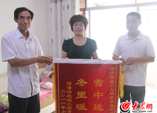 賈鳳祥和父親把印有“雪中送炭 冬里暖陽”的錦旗送到嬰貝兒健康管理顧問有限公司董事、副總經(jīng)理馬平手中