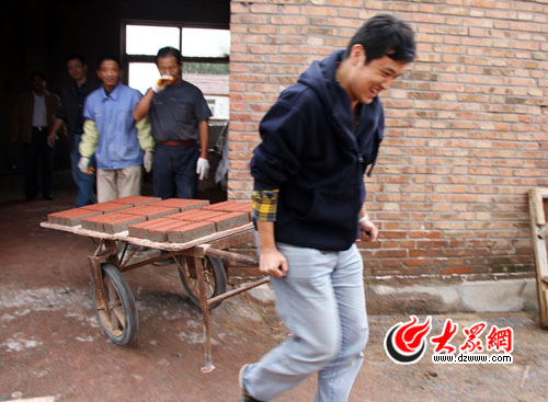 整個過程雖然看似簡單,但卻需要大量的經(jīng)驗和高度的耐心。工人師傅們不僅要指導記者正確的姿勢和手法,還要時刻提醒記者注意安全。記者目送著經(jīng)過辛苦勞動的底料和石粉一并被送進壓制機,一轉眼,12塊紅磚就新鮮出爐了。