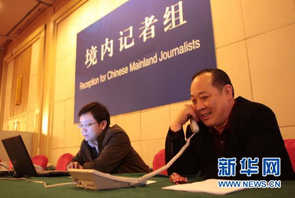 2月26日,中國(guó)聯(lián)通北京分公司的員工宋欣(左)在新聞中心值班。第十一屆全國(guó)人民代表大會(huì)第四次會(huì)議和中國(guó)人民政治協(xié)商會(huì)議第十一屆全國(guó)委員會(huì)第四次會(huì)議,將分別于2011年3月5日和3月3日在北京開幕。十一屆全國(guó)人大四次會(huì)議、全國(guó)政協(xié)十一屆四次會(huì)議在北京西長(zhǎng)安街北側(cè)的梅地亞中心設(shè)立新聞中心,負(fù)責(zé)接待和安排中外記者對(duì)會(huì)議的采訪。新華社記者 邢廣利攝