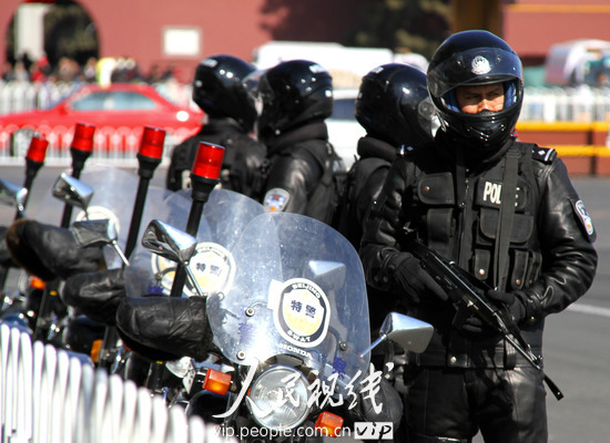 人民網(wǎng)北京3月3日電 為確保全國(guó)兩會(huì)召開(kāi),2011年3月2日北京天安門(mén)廣場(chǎng),加強(qiáng)了安全警力,武警戰(zhàn)士和公安民警在天安門(mén)廣場(chǎng)進(jìn)行執(zhí)勤、巡邏、巡查工作,為兩會(huì)保駕護(hù)航。(徐經(jīng)來(lái))