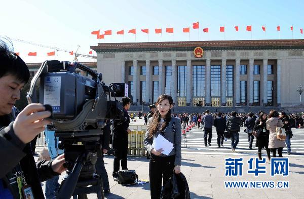 3月3日,記者在人民大會(huì)堂前出鏡錄制節(jié)目。當(dāng)日,中國(guó)人民政治協(xié)商會(huì)議第十一屆全國(guó)委員會(huì)第四次會(huì)議在北京人民大會(huì)堂開(kāi)幕。 新華社記者 楊宗友攝