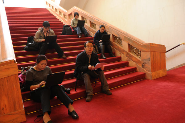 2011年3月3日,全國政協(xié)十一屆四次會議在北京人民大會堂開幕。圖為記者在現(xiàn)場發(fā)稿。