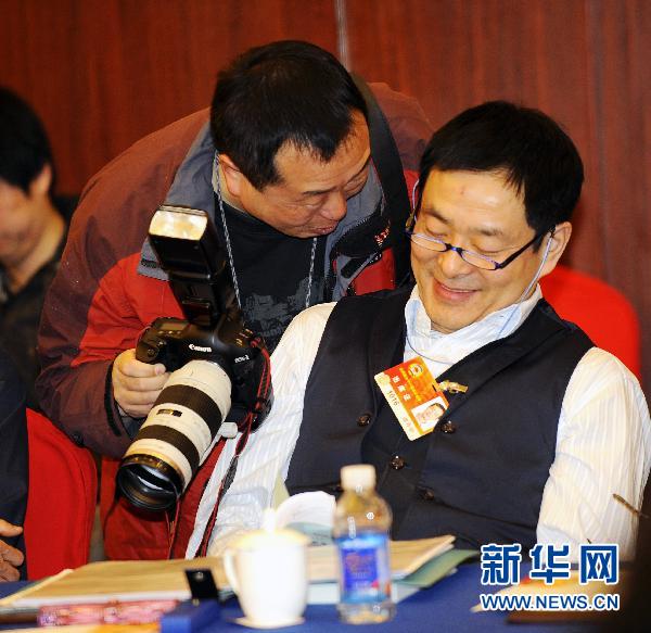 3月4日,參加全國(guó)政協(xié)十一屆四次會(huì)議的全國(guó)政協(xié)委員進(jìn)行小組討論。在小組討論中,一名攝影記者與全國(guó)政協(xié)委員濮存昕交流采訪拍攝心得。新華社記者 王曄 攝