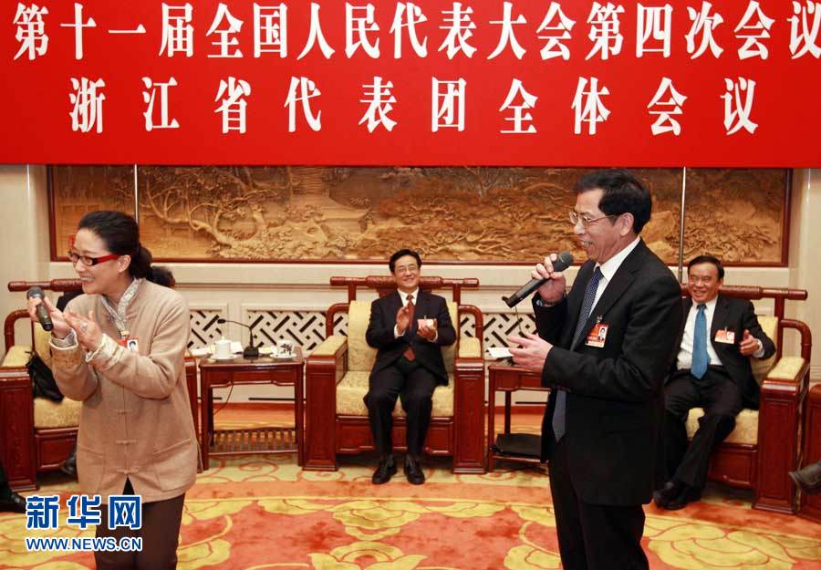 3月6日,十一屆全國人大四次會議浙江省代表團(tuán)全體會議對媒體開放。由于與會代表到達(dá)會場時(shí)距會議開始還有20多分鐘,在大家提議下,茅威濤代表與陳小恩代表現(xiàn)場表演越劇清唱。茅威濤代表(左一)是浙江省小百花越劇團(tuán)團(tuán)長、中國戲劇家協(xié)會副主席。陳小恩代表是浙江省委組織部副部長,資深越劇票友。 新華社記者龐興雷攝