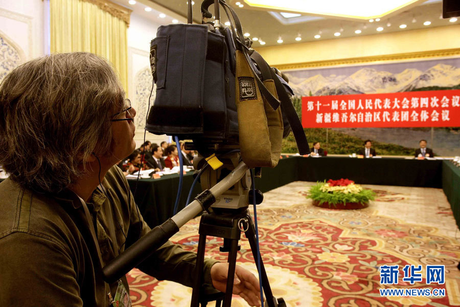 3月8日,出席十一屆全國人大四次會議的新疆代表團(tuán)在北京人民大會堂舉行全體會議。這是一位來自日本媒體的記者在現(xiàn)場采訪拍攝。新華社記者 鄭煥松 攝