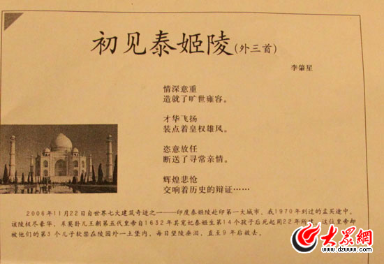 “得送你們點(diǎn)東西。”由于時(shí)間關(guān)系,剛聊了一會(huì)兒,李肇星就著急離開。臨行前,他打開隨身的公文包,將自己寫的詩(shī)《初見泰姬陵》,以及一本《世界知識(shí)》雜志送給了大眾網(wǎng)記者。