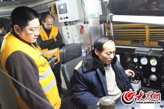記者登上出發(fā)前的機(jī)車車頭,其他的師傅們正在進(jìn)行出發(fā)前的檢查。(大眾網(wǎng)記者 馬鑫攝)