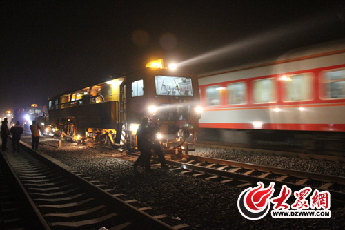 14日零點(diǎn)40分,室外溫度已接近零下6度,維修機(jī)車隨著道軌的變換再度轉(zhuǎn)場(chǎng),這群在深夜里默默工作又鮮為人知的工人師傅們又開(kāi)始膠濟(jì)鐵路客運(yùn)線上行線的搶修工作,機(jī)器再度轟鳴起來(lái),燈火依舊明亮……