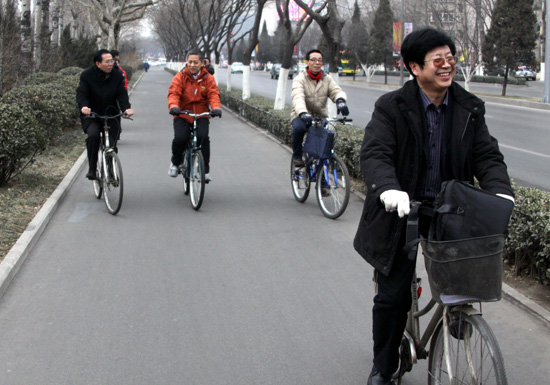 今天是山東省政協(xié)十屆四次會(huì)議與會(huì)委員報(bào)道的日子。為踐行低碳環(huán)保,給市民帶個(gè)好頭兒,省政協(xié)委員董利忠、宋傳杰、陳寶明、王福泰等下午騎自行車來到山東大廈向大會(huì)報(bào)到。隨后,宋傳杰、陳寶明兩位委員騎車前往住地。
