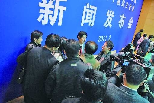 ▲12日,省兩會(huì)首場(chǎng)專題新聞發(fā)布會(huì)結(jié)束后,眾多媒體記者仍圍著新聞發(fā)言人采訪。 本報(bào)記者 劉遙 攝