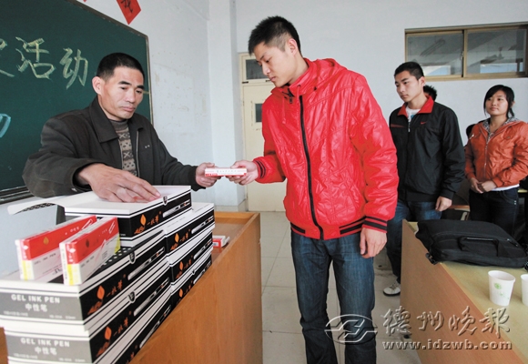 “百萬愛心筆”活動現(xiàn)場,史運倉在向?qū)W生發(fā)放愛心筆。記者 劉振興 攝