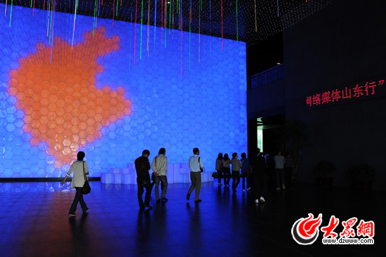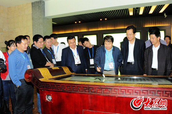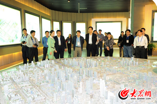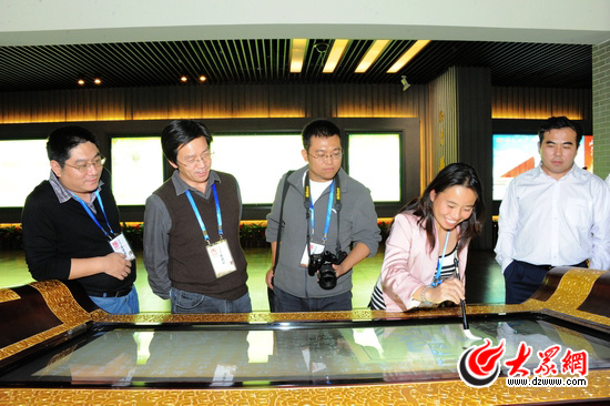 山東省網(wǎng)絡(luò)文化辦公室主任劉致福、臨沂市委宣傳部副部長劉廣闊陪同采訪團參觀規(guī)劃展覽館。(攝影 燕雨)