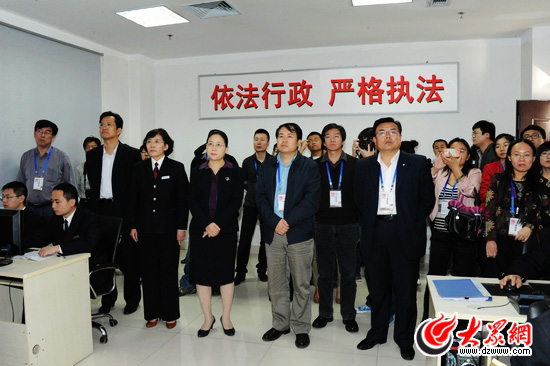 山東省網(wǎng)絡(luò)文化辦公室主任劉致福,臨沂市委常委、宣傳部長李建華陪同采訪團考察實時監(jiān)控程序。(攝影 燕雨)