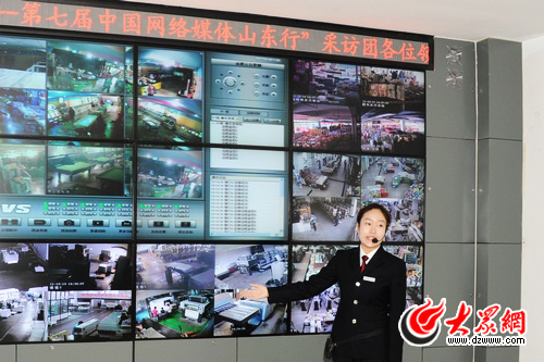臨沂市文化市場監(jiān)控指揮中心工作人員為采訪團介紹實時監(jiān)控情況。(攝影 燕雨)