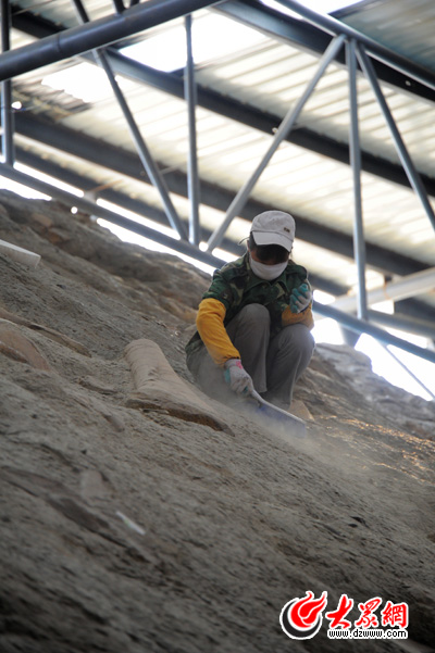 工作人員在小心翼翼的清理化石群。(攝影 燕雨)