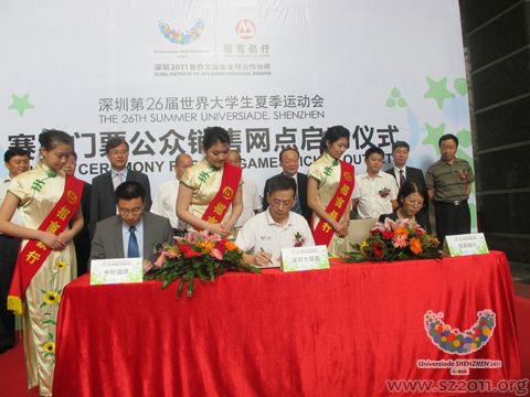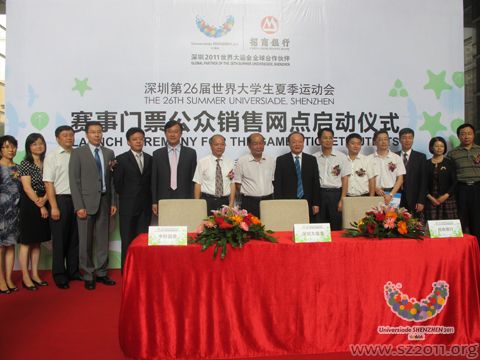 大運(yùn)網(wǎng)訊 7月11日上午,深圳2011年世界大運(yùn)會(huì)賽事門(mén)票公眾銷(xiāo)售網(wǎng)點(diǎn)啟動(dòng)儀式在招商銀行大廈總行營(yíng)業(yè)部舉行。大運(yùn)會(huì)賽事門(mén)票今天從這里開(kāi)始面向公眾銷(xiāo)售。