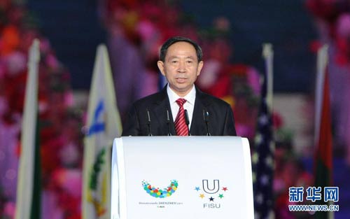 8月12日,第26屆世界大學(xué)生夏季運動會開幕式在深圳舉行。這是第26屆世界大學(xué)生夏季運動會組織委員會主席袁貴仁在開幕式上致辭。新華社記者郭勇攝