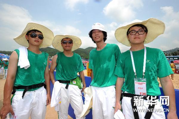 7月9日,幾名深圳信息職業(yè)技術學院的志愿者T恤被汗水濕透。7月8日至10日,作為深圳大運會沙排項目測試賽的2011年全國沙灘排球巡回賽深圳站的比賽在位于深圳大梅沙的大運會沙灘排球場舉行,來自深圳信息職業(yè)技術學院的742名志愿者頂著烈日和高溫為比賽提供志愿服務,提前為大運會做好準備。新華社記者劉大偉攝