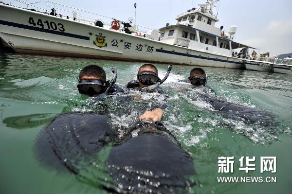 7月9日,深圳公安邊防支隊海上特勤隊隊員在進(jìn)行水下行進(jìn)協(xié)作訓(xùn)練。當(dāng)日,擔(dān)負(fù)著大運(yùn)會海上安保重要任務(wù)的深圳公安邊防支隊海上特勤隊頂著高溫和烈日進(jìn)行海上摸排訓(xùn)練,備戰(zhàn)大運(yùn)安保。 新華社記者 陳曄華 攝